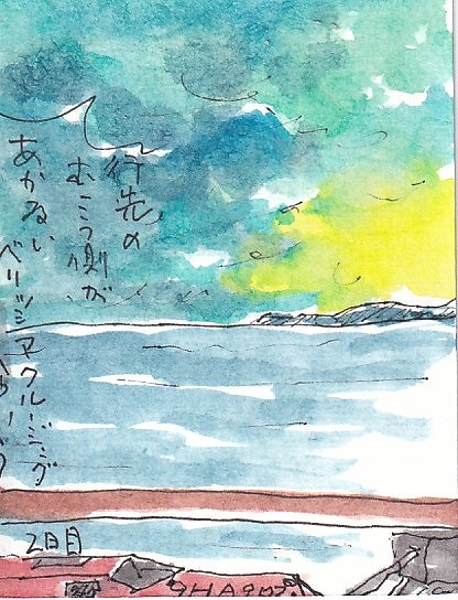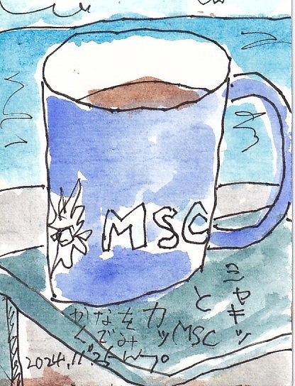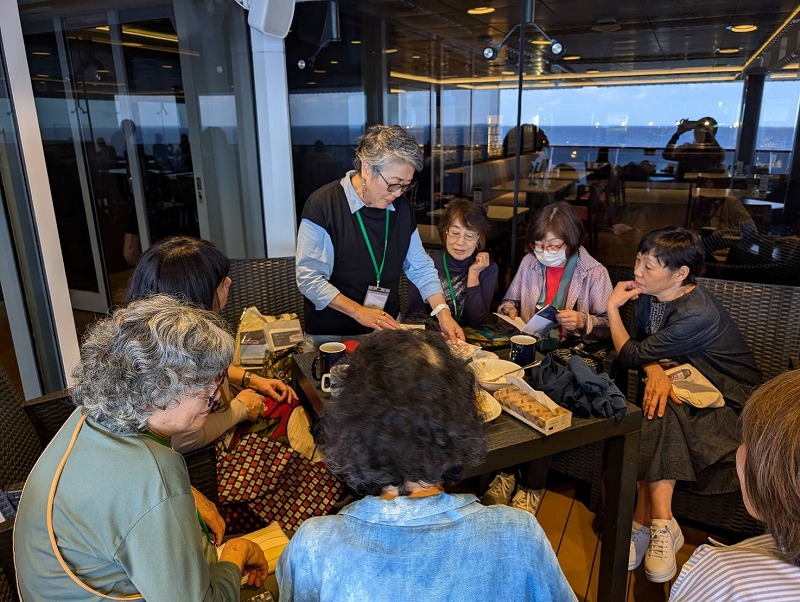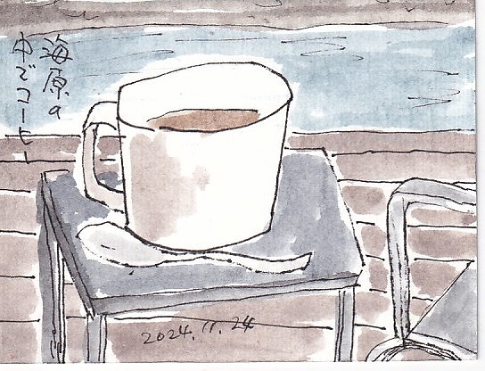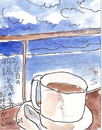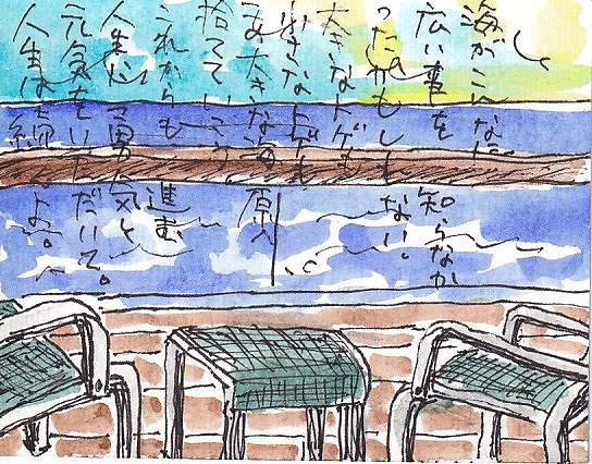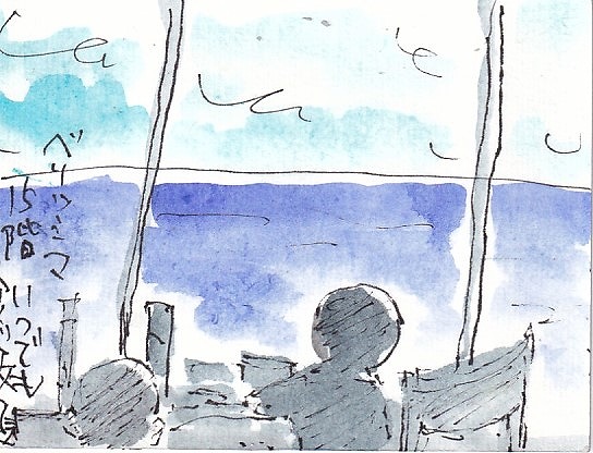 デッキで、えてがみ教室もやりながら、あっという間に5日間がすぎて行きました。はがきに線をひいたら海と空です!ほかに何もありません(笑)コーヒーカップをみんなで3分描きをしました。